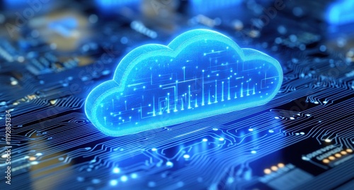 Bright Blue Cloud Icon Over Circuit Board With Data Visualization Elements Representing Cloud Computing Technology and Digital Services Integration for Modern Applications