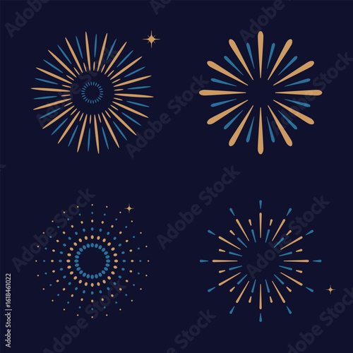 Bright blue, gold, and navy fireworks background. Use for Christmas party themes, celebration posters, banners, or invites.