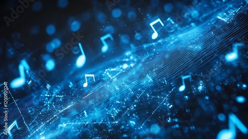 Bright blue music notes moving through an intricate digital sound wave in a visually striking artistic style