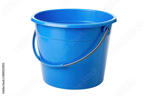 Bright blue plastic bucket with metal handle isolated on transparent background