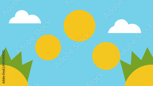 Bright Blue Sky With Three Yellow Circles, Two Clouds, And Two Green Sunbursts transparency background white