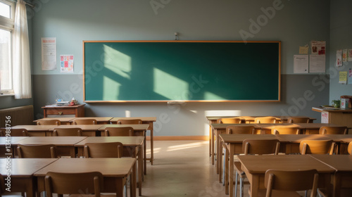 bright classroom with wooden desks and green chalkboard, creating welcoming learning environment