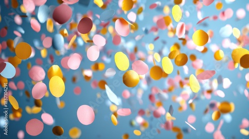 Bright colors fill the air as confetti falls from above in a lively indoor setting. The scene captures the joy of a festive occasion. Party decorations add to the cheerful atmosphere.