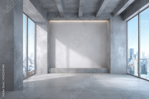 Bright concrete office space with large windows and a blank wall overlooking the city skyline, ideal for creative design or office use
