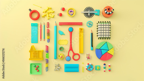 Bright educational tools arranged in a square on a light yellow backdrop.