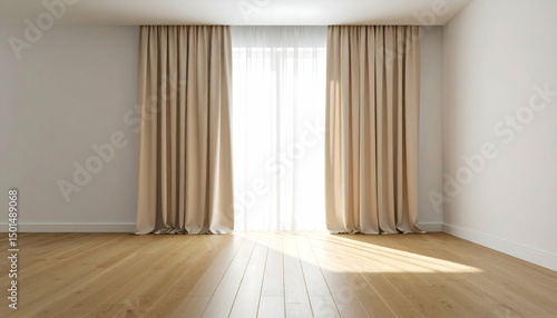 Bright Empty Room with Beige Curtains and Wooden Floor