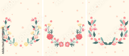 Bright floral wreaths on a pastel background. Blooming colored flowers as a symbol of happiness, joy, love. Spring wreaths are ideal for invitations, cards, banners, weddings. Vector illustration