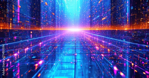 Bright futuristic cityscape. Digital grid extends toward distant light source. Vivid blues, pinks, oranges dominate scene. Immersive, hightech environment.