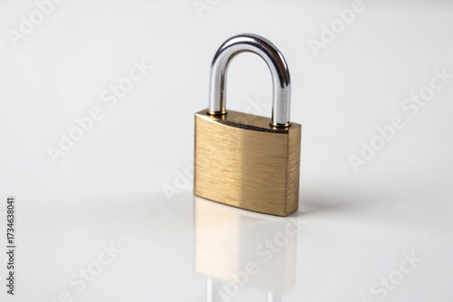 Bright, golden padlock and its reflection on a glossy white background, conveying strength and reliance