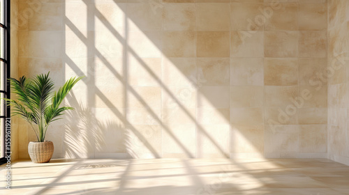 Bright interior with soft light casting long shadows on textured wall, featuring potted plant
