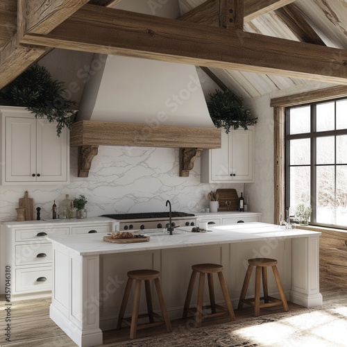 Bright kitchen interior design, featuring white cabinetry, a large island with wooden stools, exposed wooden beams, and a marble backsplash. Natural light floods the room.