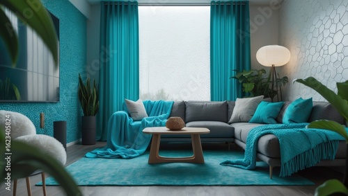 Bright living room with turquoise curtains, sofa, and decor, featuring a cozy and modern aesthetic. Interior design with vibrant accents and greenery.