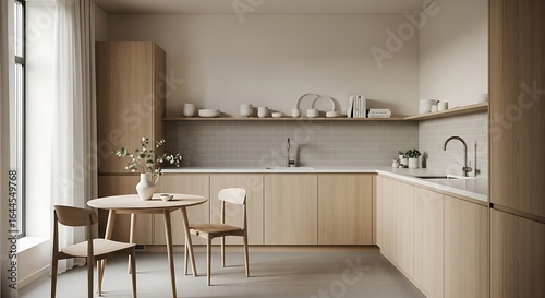 Bright, minimalist kitchen interior with light wood cabinets, a round table with two chairs, open shelving, and natural light from a window.
