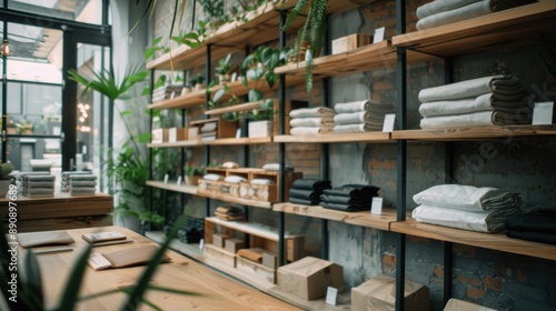 Bright modern boutique shop with neatly arranged clothing stacks, wooden shelves, and greenery creating a fresh and inviting shopping environment.