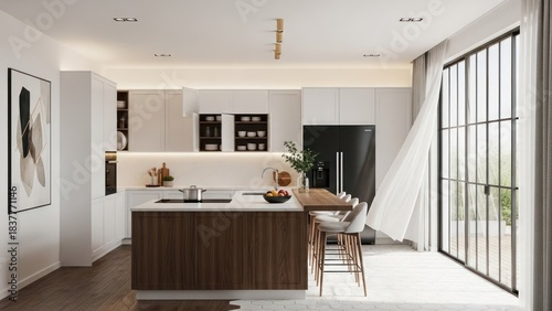 Bright modern kitchen with island, stools, white cabinets, and light curtains