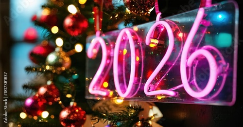 Bright neon sign displays year 2026. Festive Christmas tree visible, blurred background creates holiday mood. Warm lights illuminate scene.