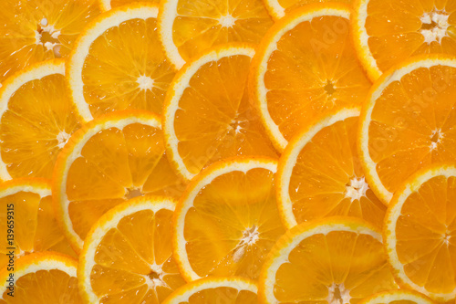 Bright orange background from slices of juicy Orange. Healthy food, background.