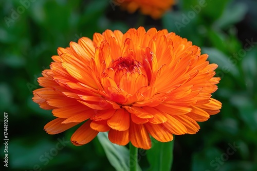 Bright orange flower in full bloom with green leaves in the background during a sunny day in a garden setting
