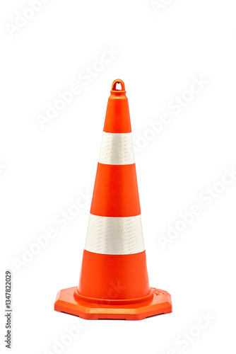 Bright Orange Traffic Cone with Reflective Stripes Displayed on a White Background for Road Safety and Navigation Purposes in Urban Environments and Construction Zones