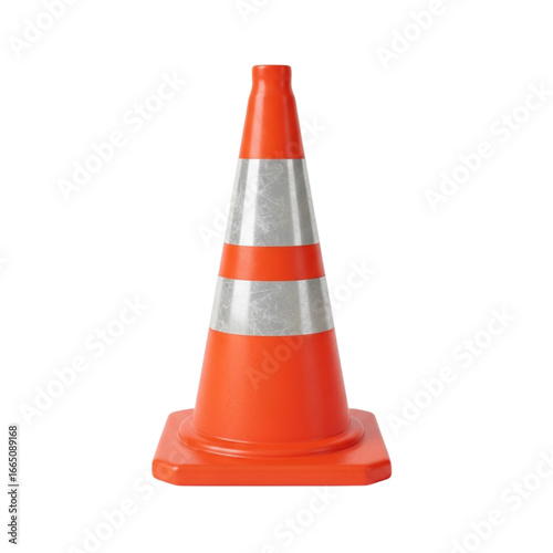 Bright orange traffic cone with reflective stripes isolated on transparent background