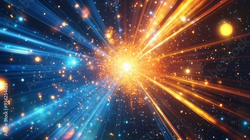 Bright radial light beams. Abstract background in blue and orange neon glow color. Light burst in universe. Space background for presentation, event, party, carnival, celebration, anniversary or