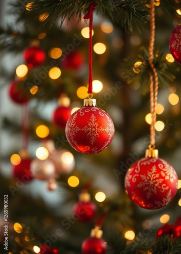 Bright red and gold christmas ornaments hang from beautifully decorated tree surrounded by soft bokeh lights that create warm festive atmosphere bokeh red bokeh abstract background glow design light t