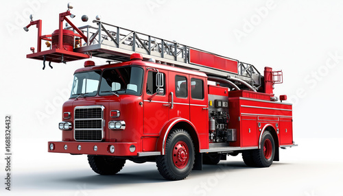 Bright red fire truck with extended ladder, essential firefighting equipment. Powerful emergency vehicle features heavy-duty wheels, sirens, lights for rapid response. Robust apparatus vital for fire