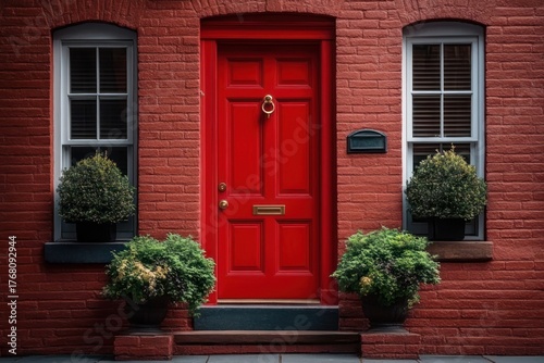 bright red front door with gold doorknob and knocker centered on a red brick house facade flanked by two windows and neatly trimmed potted shrubs below each window and beside the door
