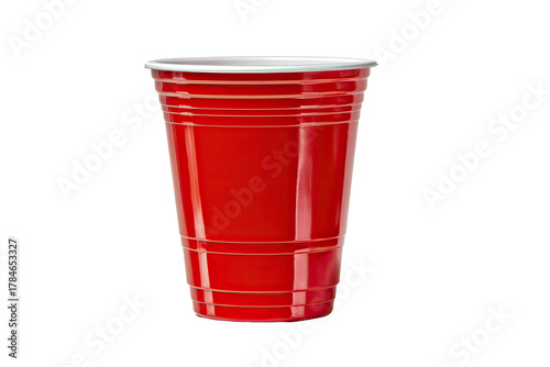 Bright red plastic cup with horizontal ridges, isolated on black