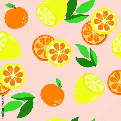Bright seamless pattern with fruits, oranges, lemons, and leaves. Vector graphics