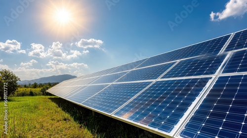 Bright solar panels capture sunlight in lush green field under clear blue sky