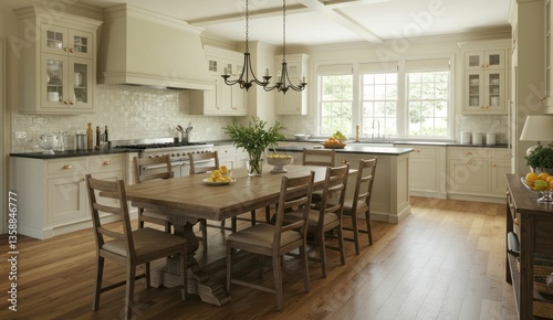 Bright, spacious kitchen with a wooden dining table and fruit,