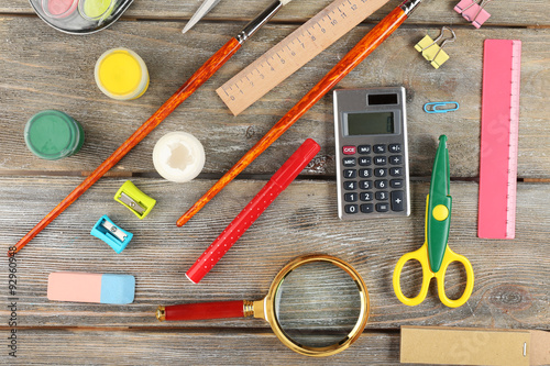 Bright stationery objects on wooden table close up