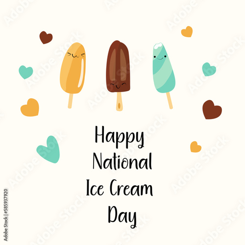 Bright summer poster with sweets. A collection of cute elements for a summer party.Vector Illustration for Happy national ice cream day on hearts background. No Diet Day , Eat What You Want Day