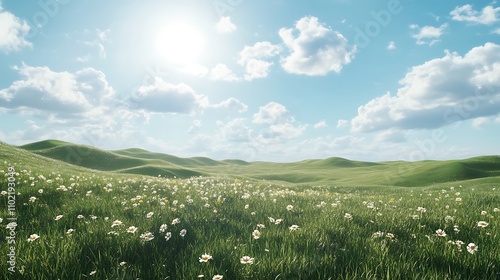Bright sunny day over green hills with wildflowers blooming and soft clouds in the sky enhancing the scenery