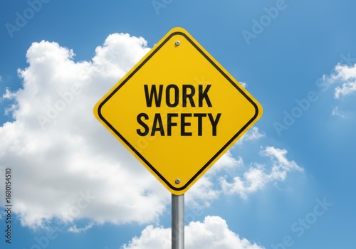 Bright yellow diamond shaped warning sign prominently displays "work safety" against a blue sky with clouds