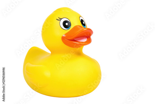 Bright yellow rubber duck toy designed for children to enjoy during bath time and swimming fun, cut out