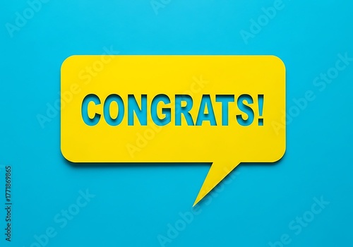 Bright yellow speech bubble displaying the word congrats against a blue backdrop