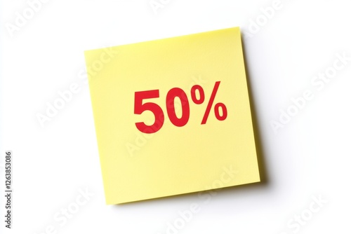 Bright yellow sticky note displaying fifty percent indicating a discount or promotion in a simple office setting