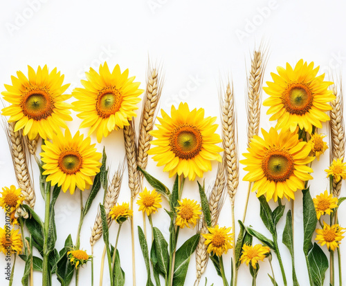 Bright yellow sunflowers and wheat arranged in a vibrant display against a plain background