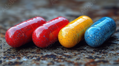 Brightly colored capsules arranged in a row on a textured surface with varying patterns and colors during daylight