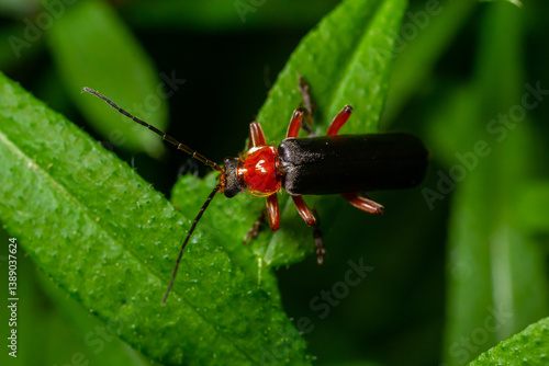 Brightly colored insect perched on a vibrant green leaf in a lush natural environment during daylight
