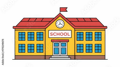 Brightly colored school building with clock and flag, representing education and learning.