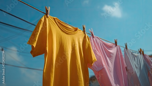 Brightly colored shirts drying on a clothesline under a vibrant sky