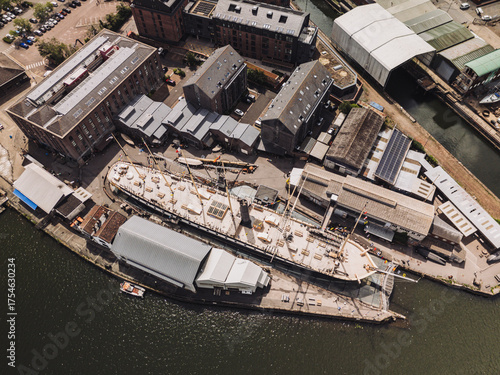 Bristol England: 28th July 2025: Drone view of Brunel's SS Great Britain rests at the dock in Bristol, surrounded by historic buildings along the River Avon