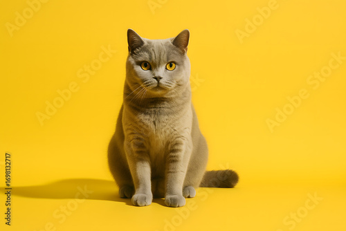 British Shorthair cat sitting and looking forward on yellow background