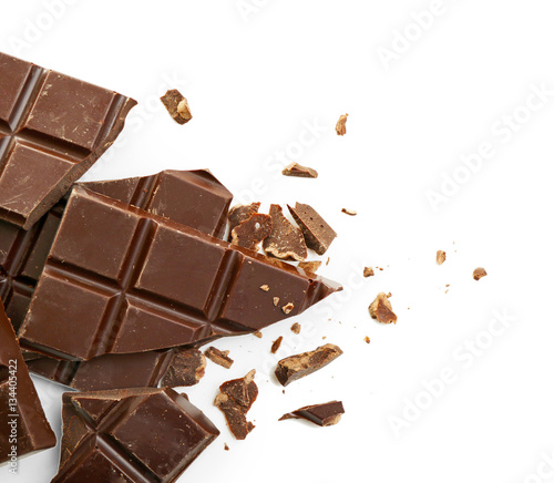 Broken chocolate bar on white background