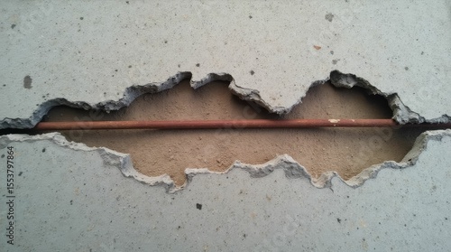 Broken concrete slab with exposed pipe creating a rough texture on surface