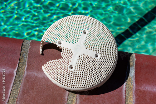 Broken, damaged pool drain cover by the edge of a swimming pool. Close-up