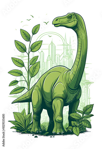 Brontosaurus Grazing Peacefully with Futuristic Green City Silhouette